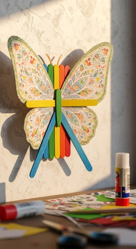 Create a bright butterfly using popsicle sticks as the body and base for the wings. Glue one stick vertically for the body, then attach two sticks angled on each side to help support paper or foam wings. Cut large wing shapes from colored paper, scrapbook sheets, or even magazine pages with fun patterns. Let kids paint the sticks in bold spring shades like purple, turquoise, or sunny yellow before attaching the wings. Add details with markers, glitter glue, or small stickers. Pipe cleaners make great antennae—just bend them into soft curves and glue them behind the top of the stick. These butterflies look lovely taped to bedroom walls, classroom boards, or craft room spaces. They are light, inexpensive, and easy to make in groups, which makes them perfect for spring parties or school art sessions.