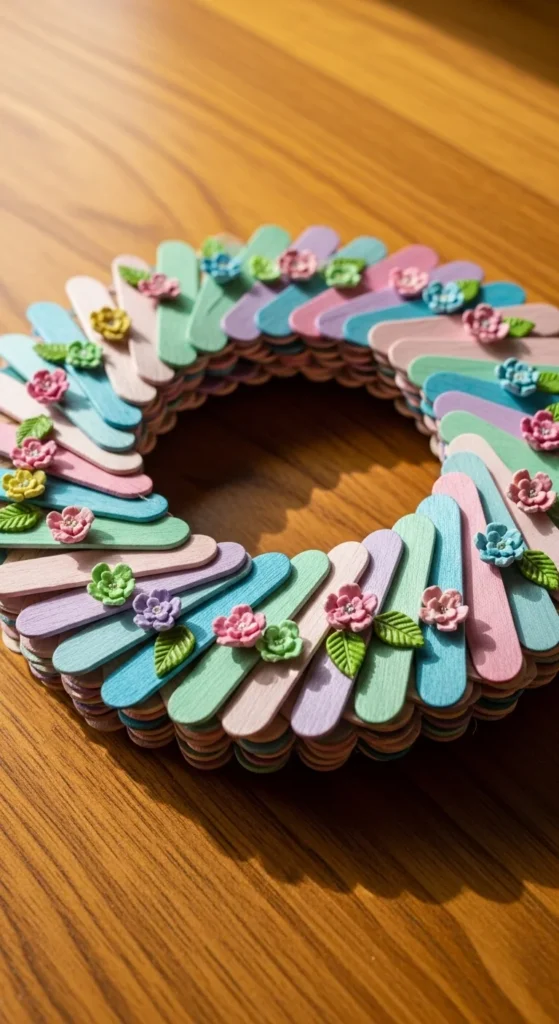Form a mini wreath by gluing popsicle sticks in a circular pattern. Overlap the ends slightly to keep the shape strong. Paint the wreath base in light green or any spring shade you like. Once dry, decorate it with small paper flowers, foam leaves, or buttons. You can also tie a small ribbon bow at the top. These mini wreaths look cute on doors, bulletin boards, or as wall accents in kids’ rooms. Because they are lightweight, double-sided tape works well for hanging. This craft is great for group settings since each person can design a different color theme while following the same base steps.