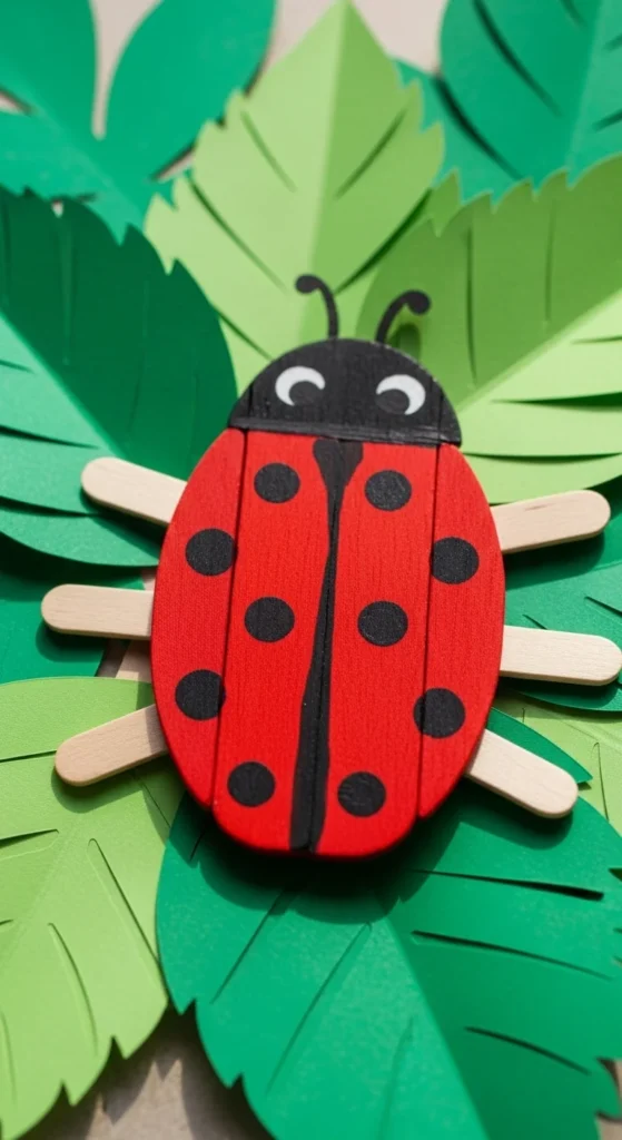 Turn popsicle sticks into adorable ladybugs by gluing several sticks side by side to form a rounded shape. Once the glue dries, paint the entire surface red. Add black spots with paint or markers, and draw a small black head at the top. Glue on googly eyes for a playful look. You can attach a magnet to the back for a fridge decoration or tape it onto a spring poster. This craft uses simple shapes and bright colors, making it ideal for preschool and early elementary kids. It’s quick to make and adds a fun bug theme to spring craft collections.