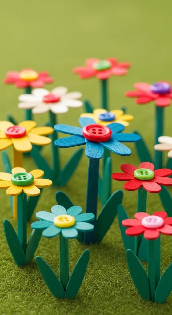 Create a garden scene by making multiple popsicle stick flowers. Glue sticks in a star shape for petals and add a round button or paper circle in the center. Paint each flower a different bright color. Arrange them on green construction paper with drawn stems and leaves. This turns into a colorful spring wall display for homes or classrooms. Kids can experiment with petal shapes and color combinations. The project is low cost and easy to adapt for different ages.