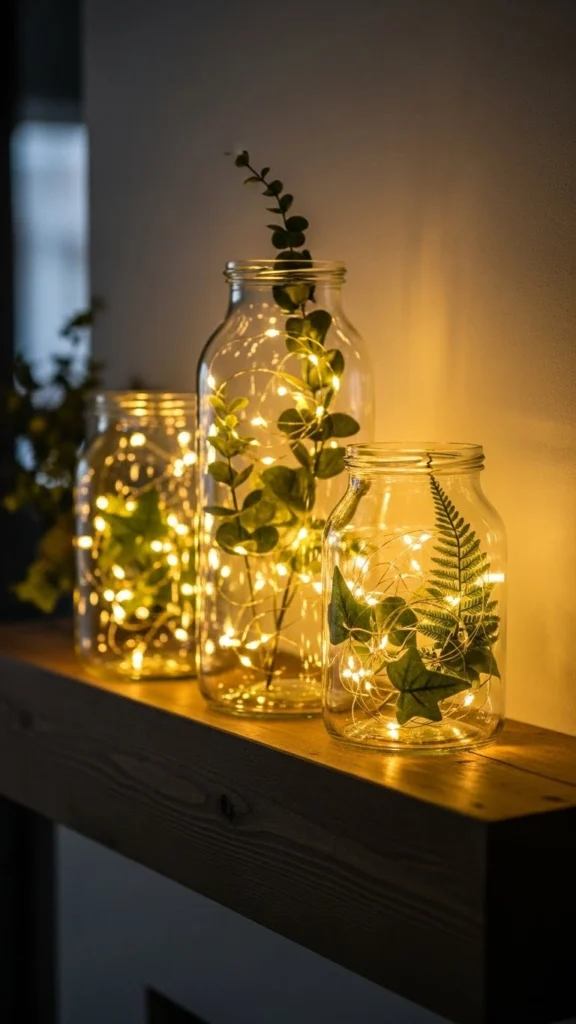 Glass jars paired with fairy lights create instant atmosphere. Place lights inside and hide the battery pack under filler like moss or beads.