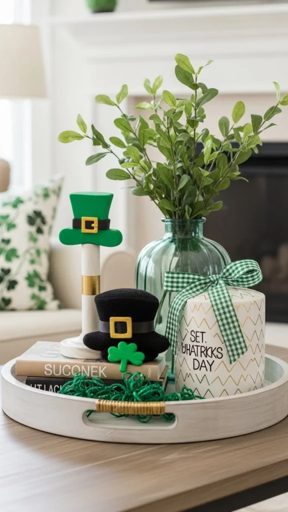 Trays help decor feel organized. Use one neutral tray and limit items to three or four pieces. A candle, greenery, and one themed object is enough.
