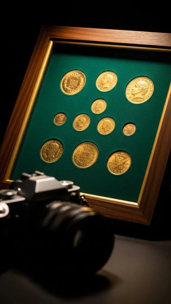 Shadow boxes add depth to walls or shelves. Line the back with green fabric. Arrange gold coins loosely rather than in strict rows.
