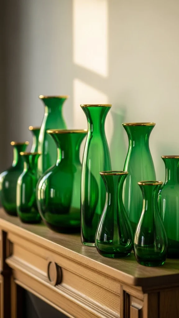 These vases look great grouped together in odd numbers. Place them on a mantel, shelf, or dining table. Add faux greenery or white flowers to keep the green balanced. The contrast between glass and gold feels refined.
