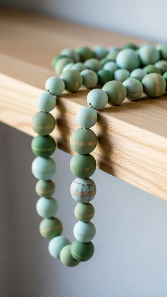 Wood bead garlands add texture. Paint them in muted green or leave some natural.