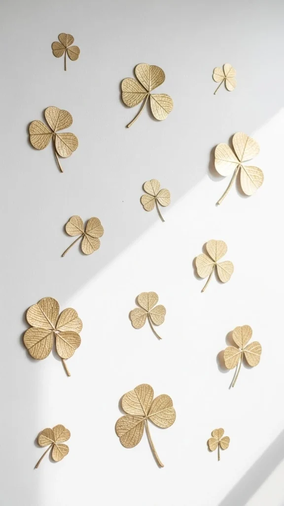 Arrange the clovers in a loose grid or line. Keep spacing even so the wall feels balanced. White walls help the gold stand out.