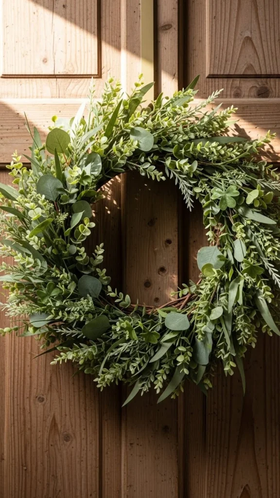 Skip bright plastic wreaths and aim for calm tones. Use a grapevine base and add muted greenery like eucalyptus-style stems. Include shamrocks sparingly.