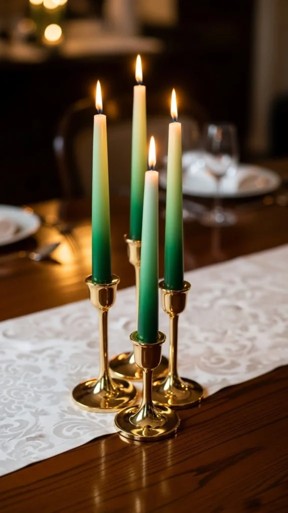 Plain candles change quickly with paint. Use two green shades. Start darker at the base and fade upward using a dry brush technique.