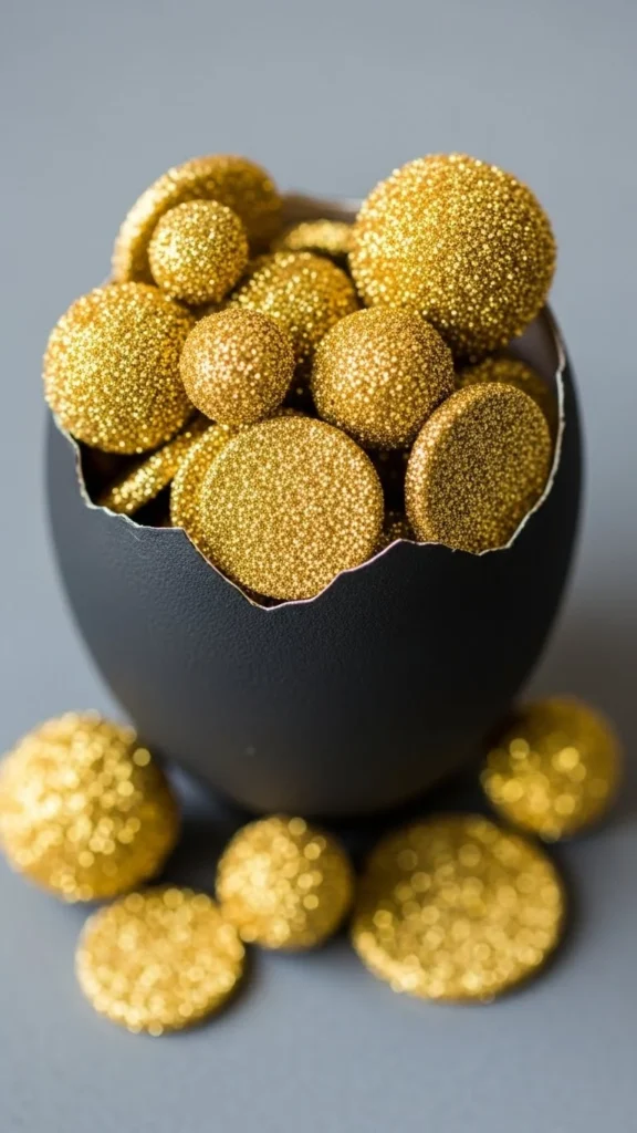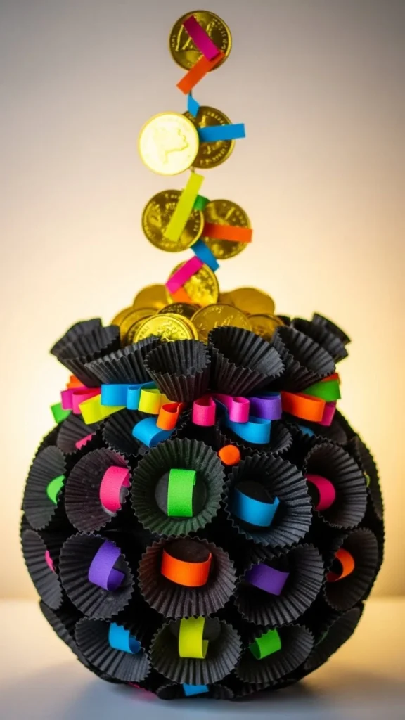 Egg cartons are perfect for mini crafts. Cut individual cups, paint them black, and fill with gold pom-poms or paper balls. Kids enjoy sorting and filling the cups, which helps fine motor skills. These mini pots work well as table decorations or party favors and use materials that might otherwise be thrown away.