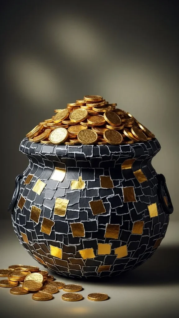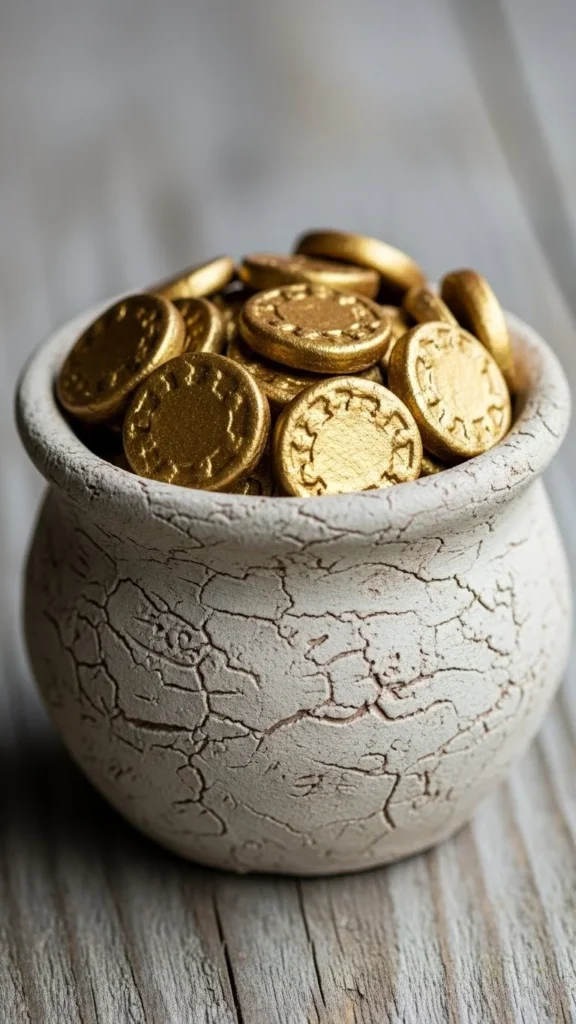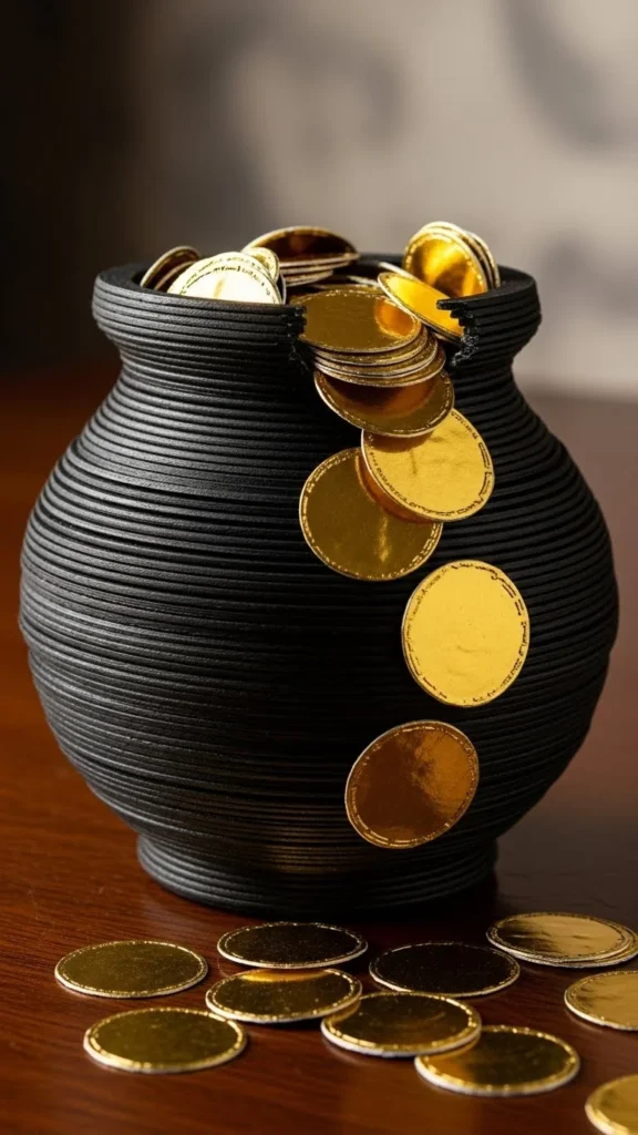Air-dry clay allows kids to shape their own pots. Roll clay into a bowl shape and let it dry fully. Paint the pot black and add gold-painted clay coins. This project takes longer but feels rewarding. Kids enjoy forming shapes and seeing them turn into decorations.