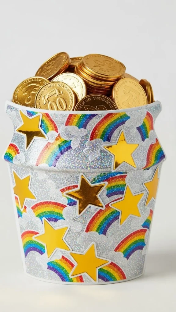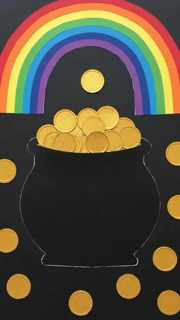 Recycling crafts often feel more meaningful to kids. Paint a toilet paper roll black and let it dry. Cut a semicircle from black paper to create the pot rim and glue it to the roll. Fill the top with gold paper coins or crumpled foil. Add tissue paper strips as a rainbow flowing out. This project shows kids how everyday items can turn into decorations. It also keeps material costs near zero, which parents appreciate.