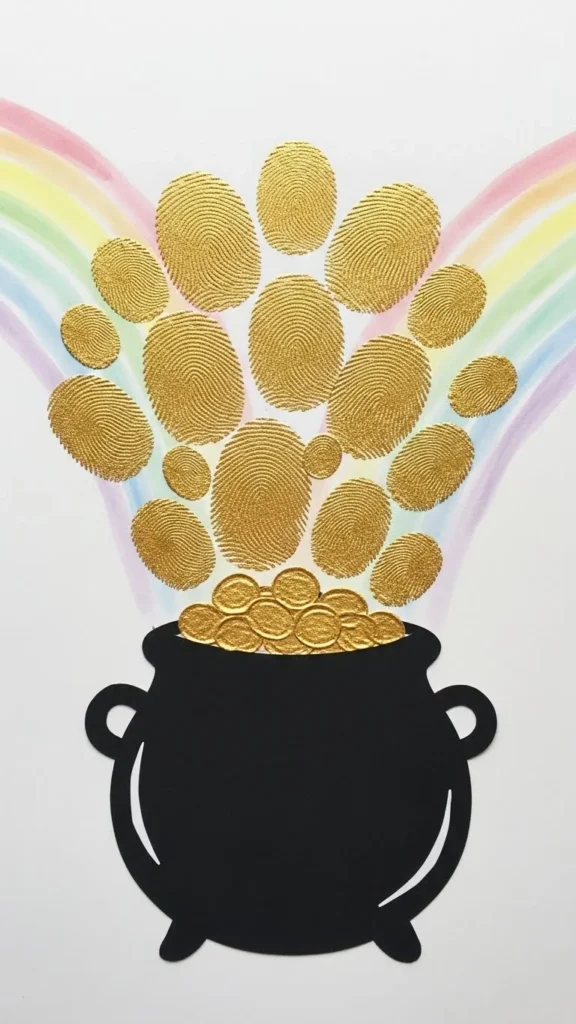 Fingerprint crafts add texture and fun. Draw a pot shape and let kids dip fingers in gold paint to create coin dots above it. Add a rainbow once the paint dries. This craft feels playful and interactive, making it popular with younger kids. Washable paint keeps cleanup simple.