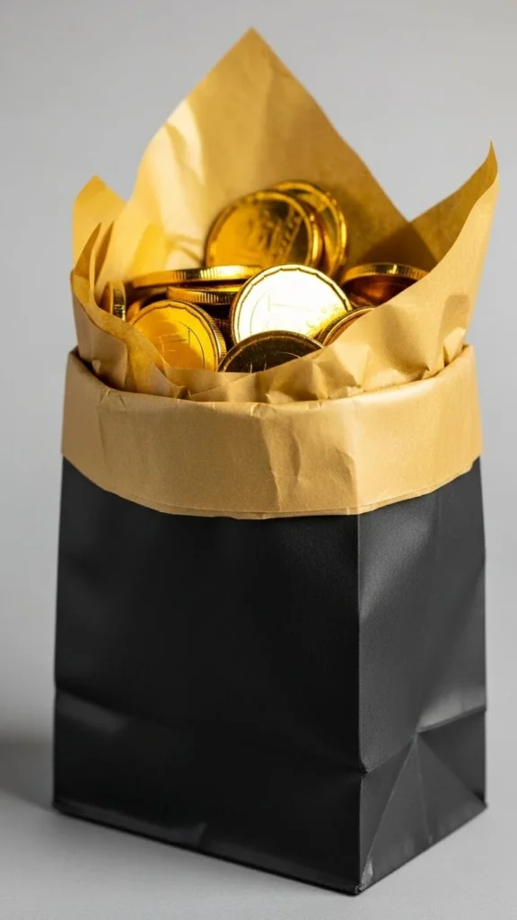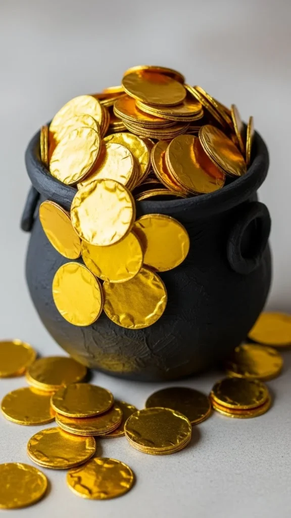 Paper bags can turn into standing pots. Paint the bag black and fold the top edge outward. Fill with gold tissue paper and coins. This craft works well for party activities and can hold small treats afterward. Bags are inexpensive and easy to find.