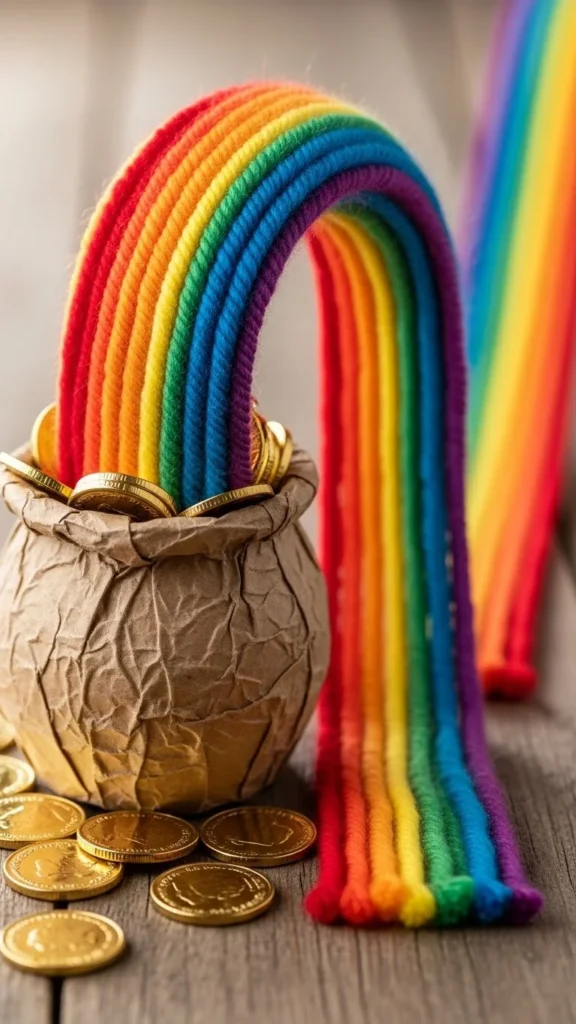 Yarn rainbows add softness and color. Glue yarn strands in rainbow order above a paper pot shape. Add gold paper coins at the base. This craft helps kids practice placing materials carefully and looks great on display boards.