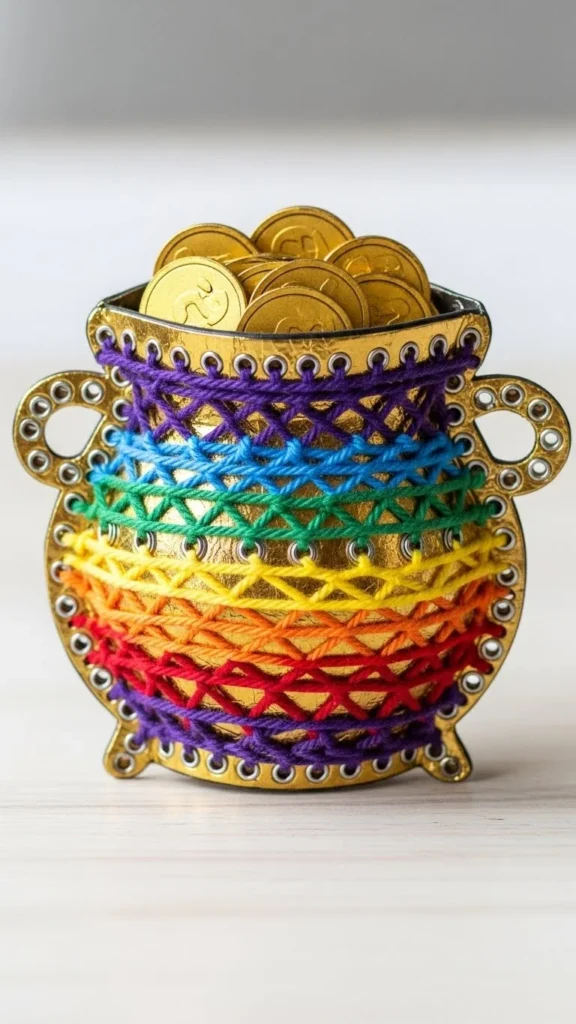Punch holes around a paper pot shape and let kids lace yarn through. Add gold paper coins inside the pot. This activity supports fine motor practice while still feeling playful. It works well for older preschool and early elementary kids.