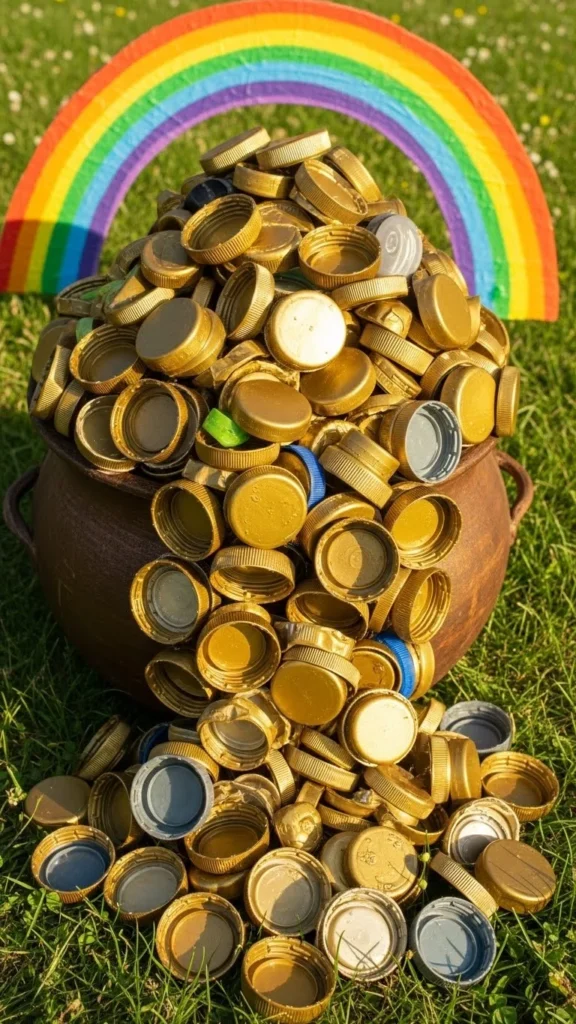 Paint plastic lids gold and glue them onto paper above a pot shape. This craft teaches reuse while keeping costs low. Kids enjoy collecting and arranging lids, which adds a playful element.