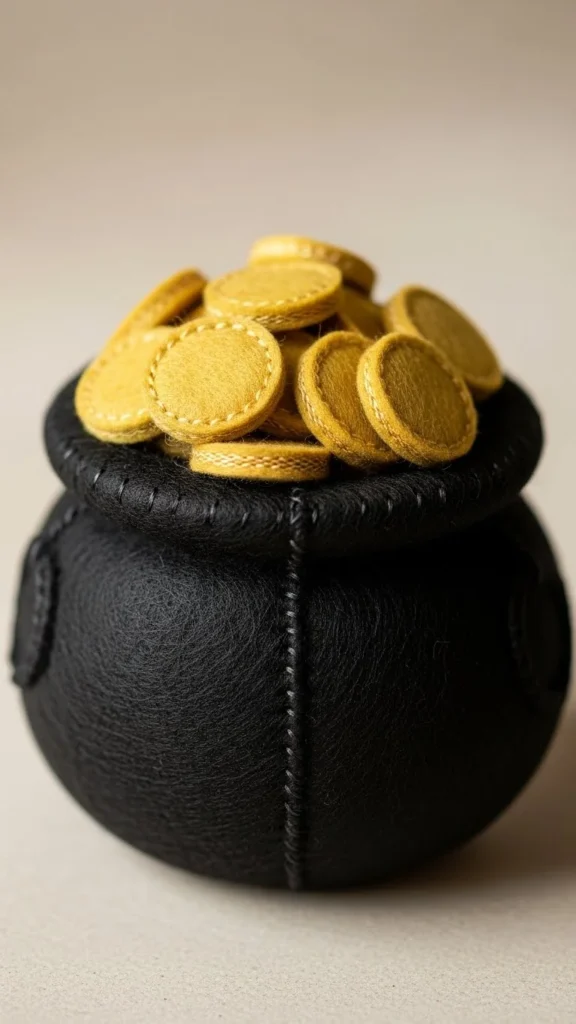 Felt pot of gold pouches are great for slightly older kids. Cut two pot shapes from black felt and glue or stitch the edges together, leaving the top open. Add felt coin shapes inside. Kids can help decorate the front with glue-on accents. This project introduces basic crafting skills while still being manageable. The pouch can later hold treats or small toys, which adds extra excitement.