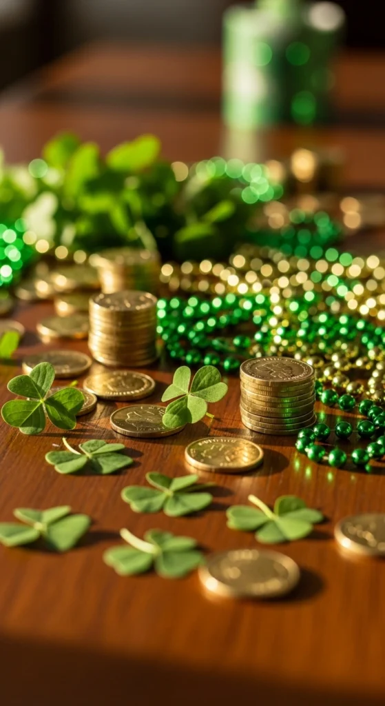 Table scatter adds texture and fills empty spaces without clutter. Use small shamrocks, gold beads, or coin shapes. Scatter them lightly around centerpieces and place settings. This adds sparkle and interest from every angle. It is a quick way to enhance the festive look.