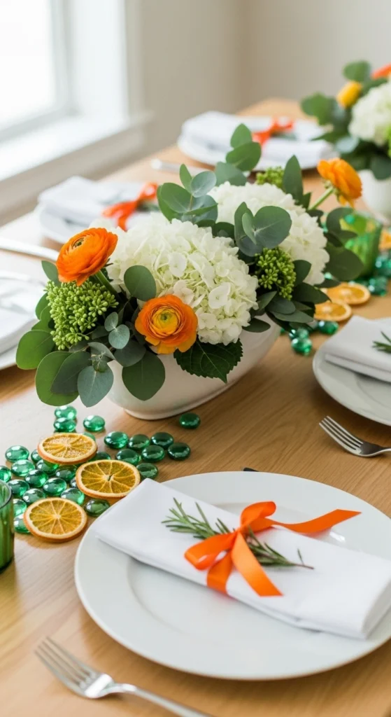 Irish flag colors bring a meaningful and balanced look to the table. Use green, white, and orange elements in napkins, flowers, or small decor items. Keep the colors evenly spaced to avoid overpowering one shade. This color mix feels festive and intentional. It adds cultural charm to your setup.