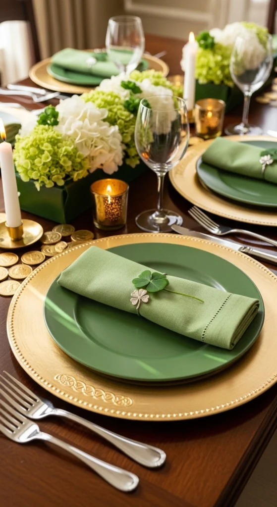 Gold foil wrapped utensils add shine without extra decoration. Wrap the handles lightly and leave the tops visible. This creates a stylish accent that pairs well with green napkins. Place them neatly beside each plate for consistency. It is an easy detail that makes a big visual difference.