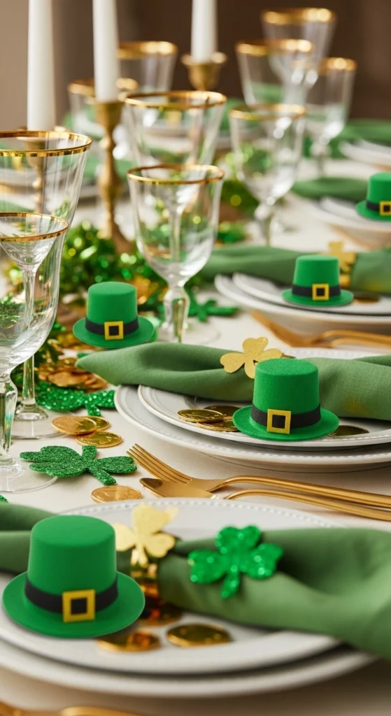 Mini leprechaun hats add playful character to your table decor. Use them as small center accents or place one at each setting. Their dark color contrasts nicely with green and gold elements. They bring a fun, lighthearted touch to the overall setup. This idea works especially well for family gatherings.
