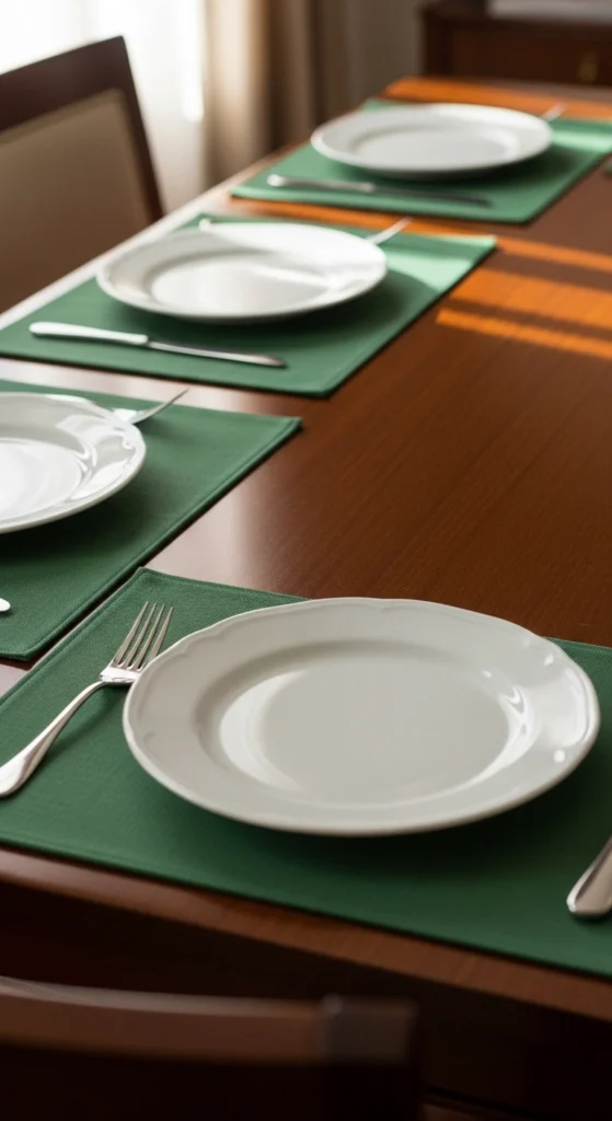 Green fabric placemats help frame each place setting cleanly. Choose solid colors or subtle patterns to match the theme. They protect the table surface while adding structure to the layout. Placemats also make the setup feel organized and intentional. They can be reused for future celebrations.