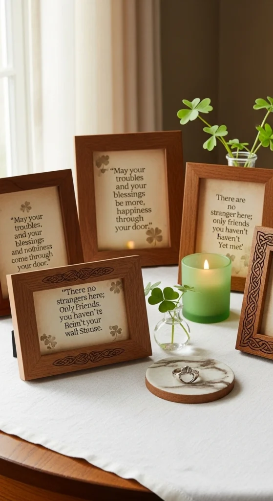 Mini framed quotes add personality to the table. Choose simple frames and short Irish sayings. Place them near centerpieces or between settings. Keep the design minimal so it does not overpower the table. These frames also double as keepsakes after the event.