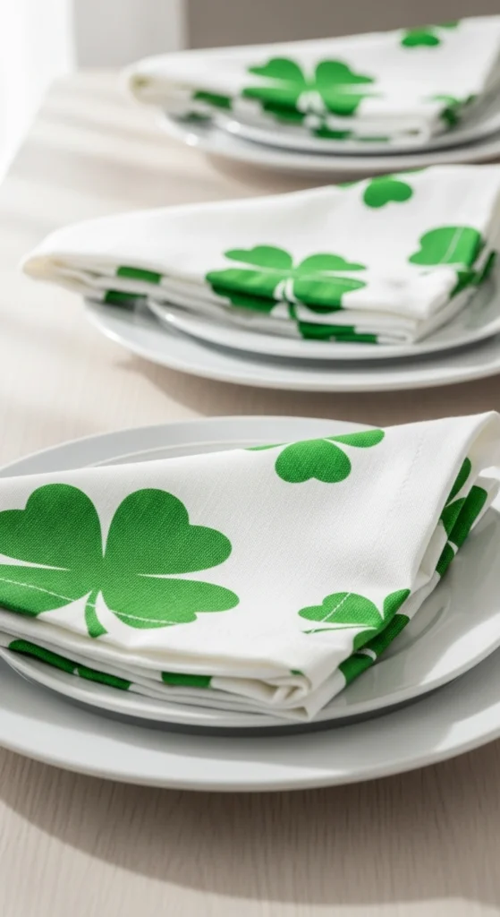 Shamrock printed napkins bring pattern and charm to each setting. Fold them simply to keep the look clean. Pair them with plain plates for balance. This small detail helps tie the theme together. It also adds interest without overwhelming the table.
