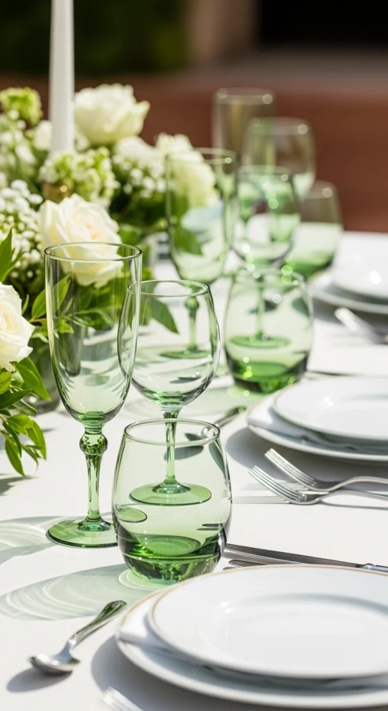 Green glassware adds color while staying functional. Use them for water or beverages to match the theme. Their transparent look keeps the table light and airy. Place them consistently at each setting. This detail feels elegant and practical.