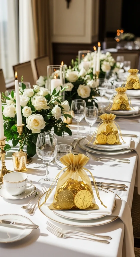 Gold coin favors double as decor and gifts. Place them on plates or beside napkins. Use small bags or jars for a neat presentation. Guests enjoy taking them home after the meal. This adds a thoughtful and festive touch.