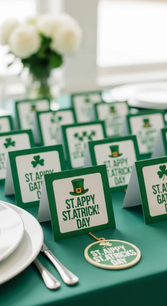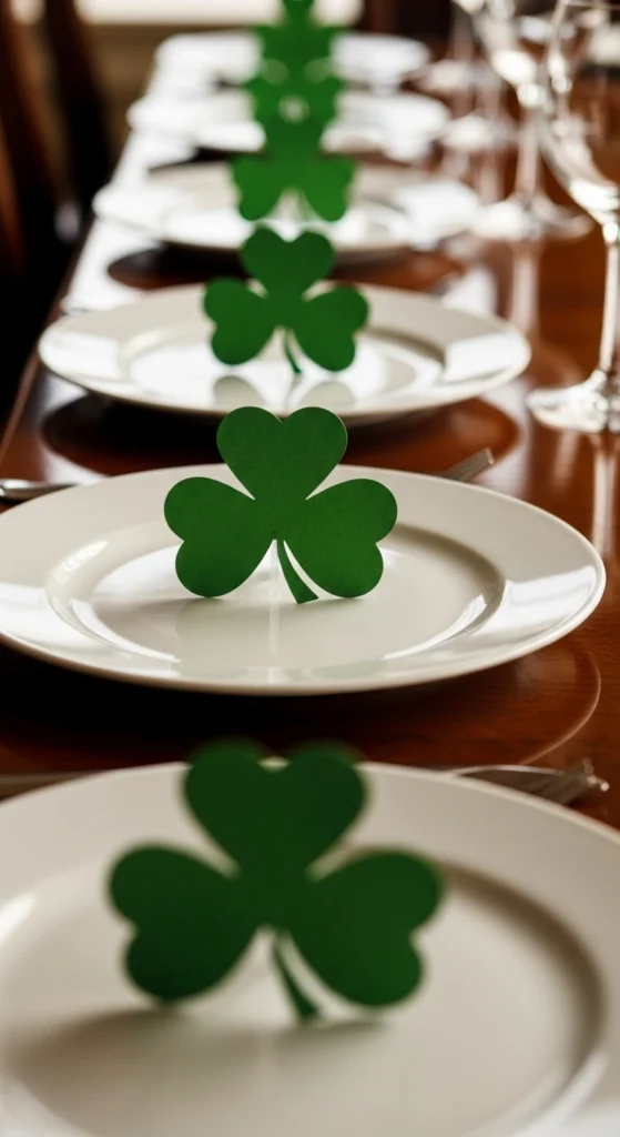Lucky clover place cards make each guest feel welcomed and appreciated. Cut clover shapes from green cardstock or felt and write names clearly on the front. Place them on plates, napkins, or small stands near each setting. This small detail adds charm while keeping the table organized. It also gives your setup a thoughtful and personal touch.