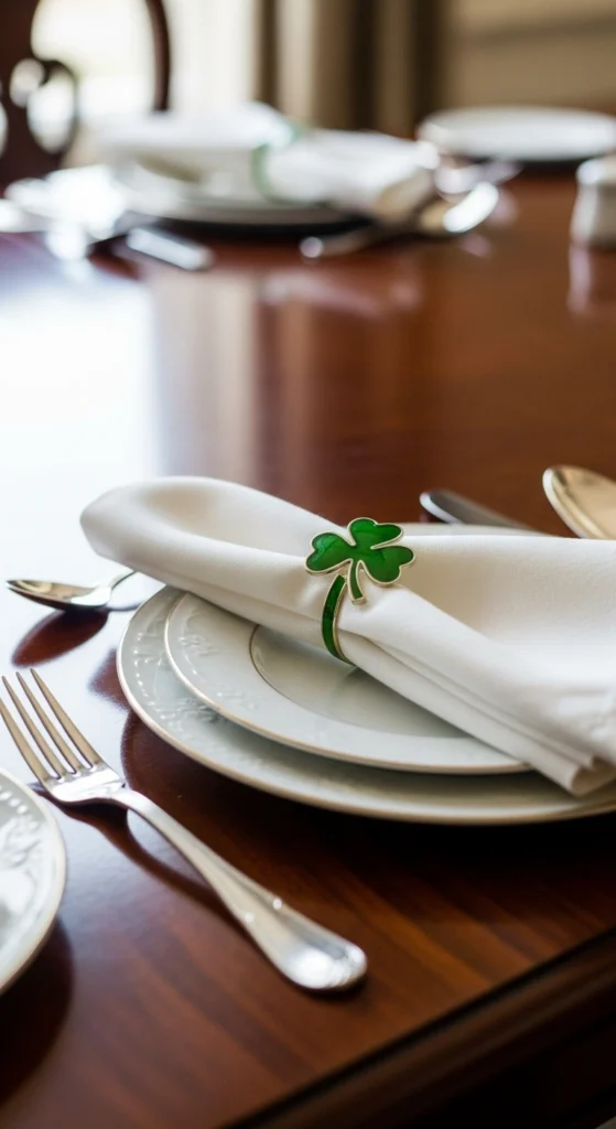 Shamrock napkin rings add a neat and festive touch to each place setting. Cut shamrock shapes from felt or cardstock and attach them to simple rings. Slide them over folded napkins for a clean look. This detail instantly upgrades plain tableware. It also helps keep napkins organized and decorative.