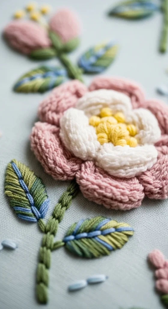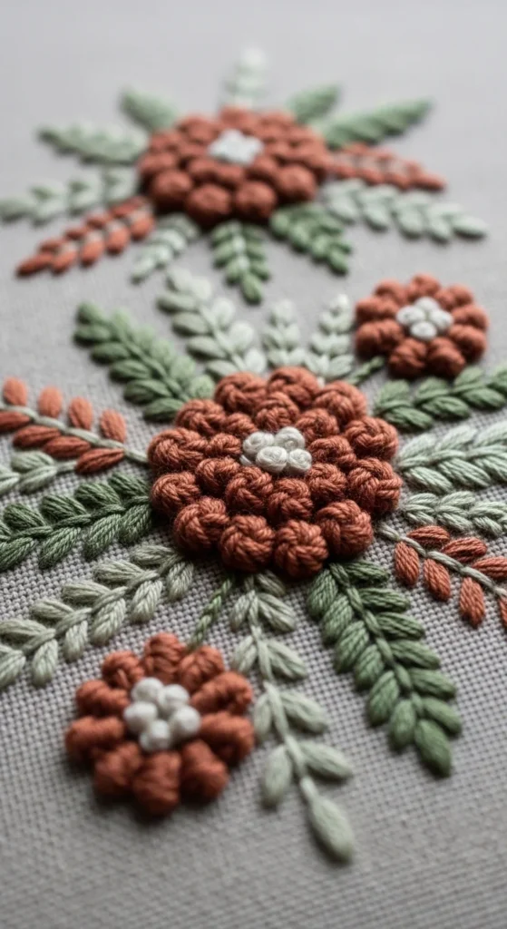 French knots and bullion knots are perfect when you want texture without a huge pattern. A cluster of knots can become a flower center, berry bunch, tiny blossom cloud, or textured abstract patch. These stitches add raised detail that looks charming even in very small areas. A good beginner-friendly pattern might be a simple stem with leaves and a knot cluster at the top to suggest wildflowers. This style works well because the texture itself carries so much visual interest. If your lines are still improving, knot-based details can help the piece feel fuller without relying on perfect outline work. Keep the first project small and use a fabric that holds tension well, like cotton or linen. If you want to save supplies, use leftover thread bits in related shades for the knot sections. Mixed pinks, creams, yellows, or greens often look natural together. Knot clusters are especially lovely on botanical hoops, denim details, and little embroidered gifts because the raised stitching gives them a handcrafted feel right away. This pattern style is simple to scale up or down, which makes it very useful for beginners and for decorative finishing touches alike.