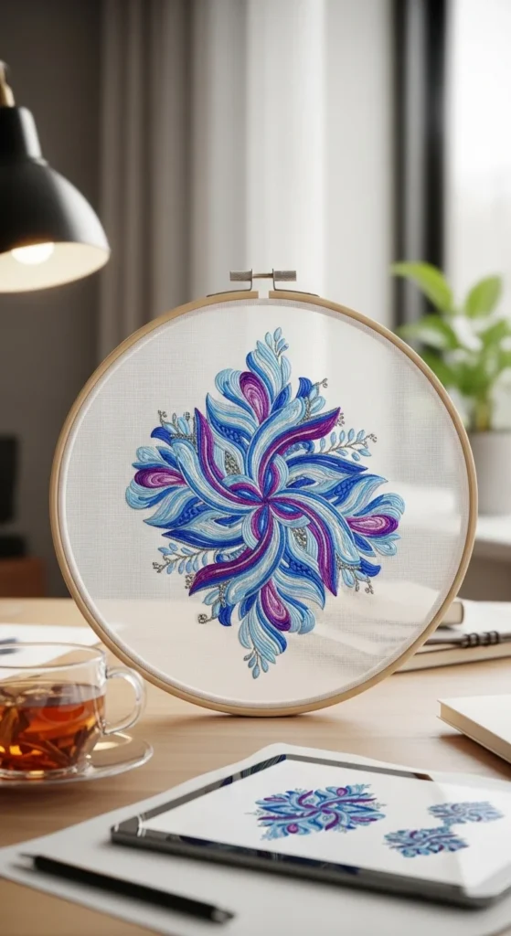 Digitally inspired embroidery patterns are becoming more common because they give makers access to unusual layouts and fresh visual ideas. These motifs often mix florals, curves, abstract geometry, celestial elements, or layered line art in ways that feel less traditional. If you like modern embroidery but do not want to draft every design by hand, a digitally planned pattern can be a good starting point. A helpful way to keep this affordable is to print or trace a simple downloaded pattern and stitch it with thread colors you already own rather than buying everything shown in a sample. Choose one design with clear shapes and not too many tiny sections if you are new to this style. AI-inspired motifs often work well in hoop art, notebook covers, decorative patches, and tote bags because the pattern itself becomes the focus. The nice thing about this approach is that it lets you explore combinations you might not sketch on your own. It still becomes handmade once you choose the thread, the fabric, and the stitch style. This kind of pattern is great for makers who want something a little more current, unusual, and design-led while still keeping the work practical at home.