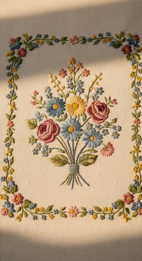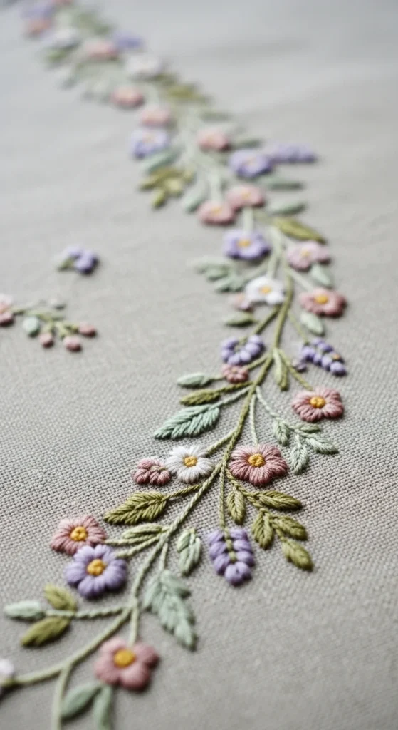 Border embroidery is a practical style because it frames fabric beautifully without needing a central motif. A wildflower trail running along the edge of a napkin, sleeve, table runner, scarf, or pillowcase can look charming and handmade in a very natural way. This kind of pattern usually works best with a loose stem, tiny blossoms, and repeated small leaves rather than one large focal flower. That makes it easier to continue the design as far as you want. A border also feels less intimidating than a center composition because you can build it gradually. Stitch one section, then add the next. If you want to save supplies, use two or three thread colors only and let repetition create the richness. Wildflower borders look lovely in soft meadow tones, but they can also work in monochrome for a quieter effect. This pattern style is especially good for people who want embroidery that decorates fabric gently rather than taking over the whole surface. It is delicate, useful, and easy to adapt for gifts or household pieces.