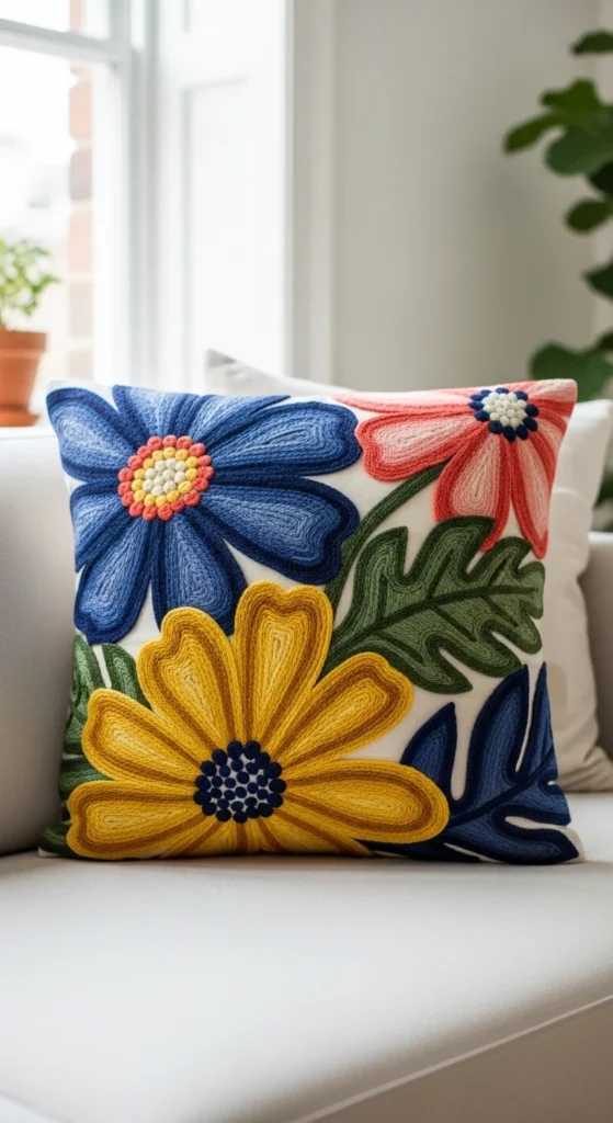 Oversized floral patterns are great when you want a dramatic result without stitching dozens of tiny details. One very large bloom can fill a hoop, decorate the center of a cushion, or spread across the back of a jacket in a way that looks bold and artistic. This style is especially helpful if you like florals but do not enjoy very small, tight stitching. Larger petals give you more room to work and make the design easier to manage visually. A good beginner version could be one giant daisy, poppy, or abstract rose with two big leaves. Use broad satin stitches, long-and-short sections, or simple outline work depending on your comfort level. This style also helps you save time because a single large motif often feels complete without lots of filler. If you want to keep costs low, use fewer colors and let scale carry the impact. Big floral embroidery looks especially good on cushions, wall hoops, tote bags, and statement clothing pieces. It feels modern, eye-catching, and a little more daring than smaller scattered florals while still staying very approachable for DIY.