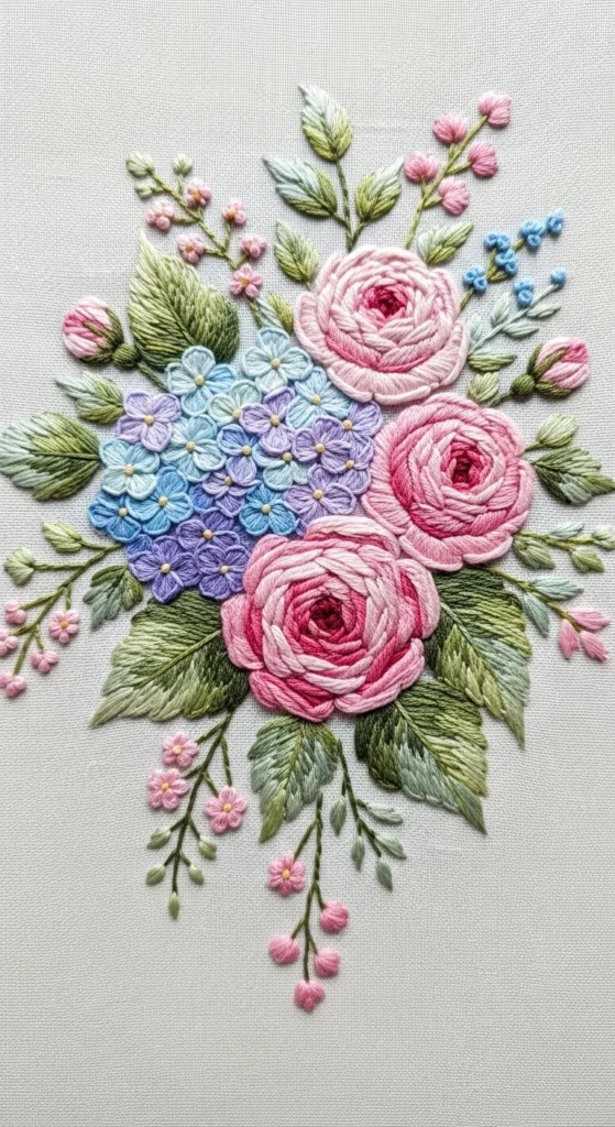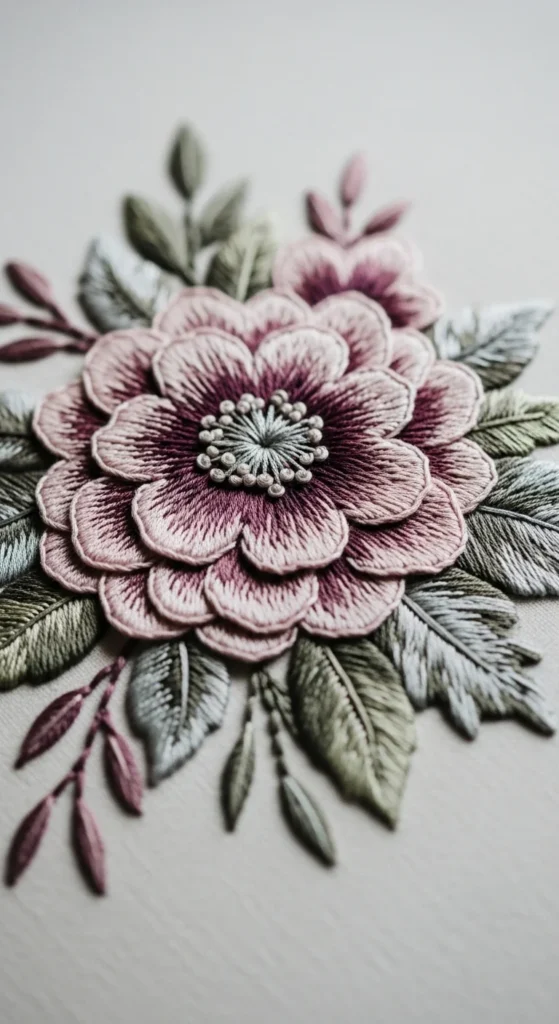 Thread painting is ideal when you want embroidery to look more like art than pattern. Instead of using just outlines or flat fills, this style layers close stitches in shifting shades so petals and leaves look softly shaded. It can create a very realistic effect, but it does not have to be intimidating. A small petal cluster in two or three shades is enough to begin. Try one flower head and keep the background empty so the detail has space to stand out. This kind of embroidery works beautifully in hoops, framed pieces, and keepsake gifts because people can really see the stitched color transitions. If you want to keep it budget-friendly, choose one flower and use just a light, medium, and dark version of the same color family instead of buying a huge range of floss. This pattern style rewards patience, but even a partial attempt often looks lovely. The soft color shifts make the embroidery feel hand-painted and delicate. It is a wonderful option for stitchers who enjoy slower work and want to create something that feels artistic, layered, and full of quiet detail rather than bold graphic shapes.