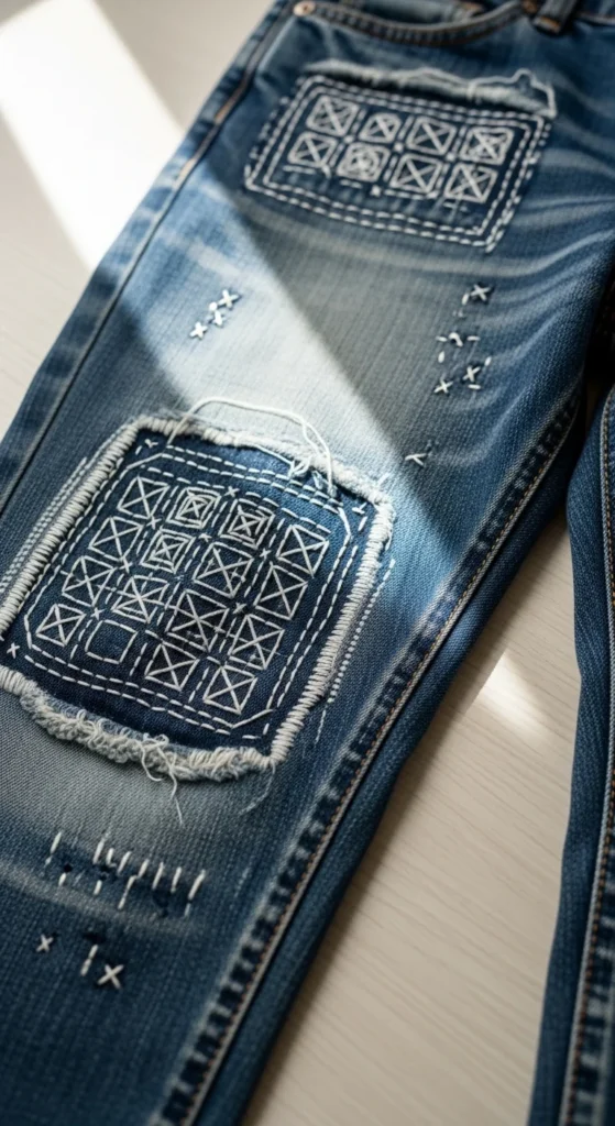 Functional embroidery patterns are a wonderful choice when you want your stitching to decorate and strengthen fabric at the same time. Inspired by visible mending and sashiko-style layouts, these patterns use repeated running stitches, grids, and geometric forms to reinforce worn areas on jeans, jackets, bags, or household cloth. The beauty of this style is that it feels useful as well as decorative. A patched knee or thin elbow becomes more interesting once stitched with a clean pattern. Start with a simple line grid, diamond pattern, or box repeat rather than a very dense all-over design. This keeps the project manageable and helps the structure of the stitches stay even. If you want to save money, use embroidery to extend the life of fabric you already own rather than stitching new material. Visible mending patterns often look best when the thread contrasts with the fabric, but soft tonal stitching can work beautifully too. This style is ideal for people who like practical DIY, geometric repetition, and projects with a clear purpose. It turns wear and repair into part of the beauty instead of something to hide.