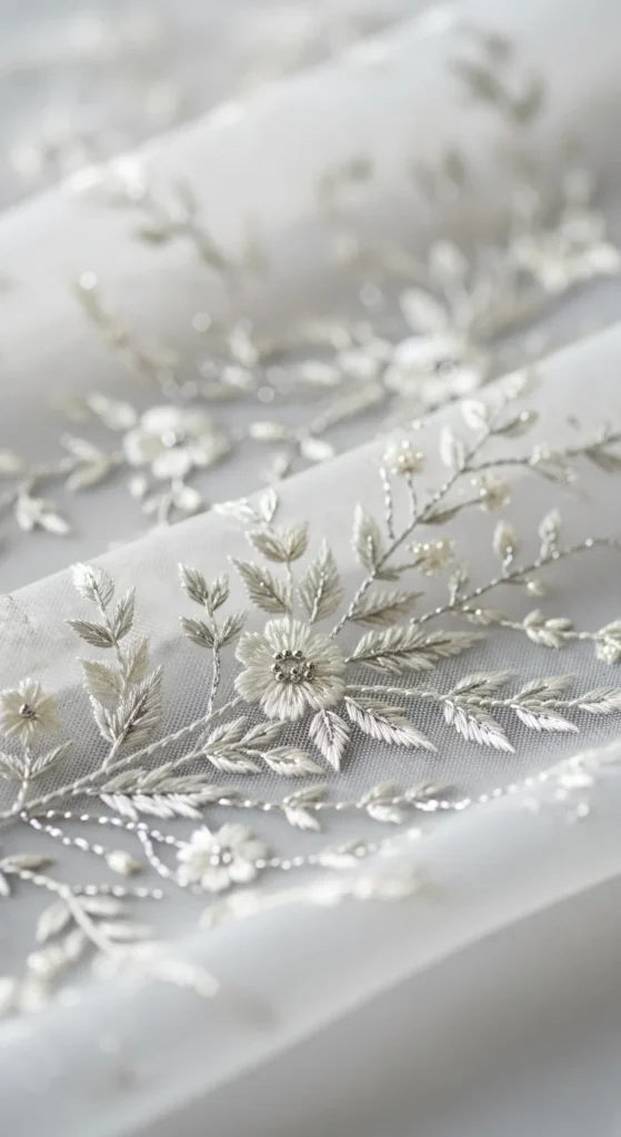 Dainty vine embroidery is perfect for pieces that need a soft, elegant touch. A slim branch with tiny leaves, scattered buds, and miniature blossoms can look beautiful on handkerchiefs, dupattas, cuffs, bridal accessories, ring pillows, or gift pouches. This style feels graceful because it uses space carefully. The fabric stays visible, and the vine moves lightly rather than filling every area. A good way to start is with one long curved stem and small leaves stitched in pairs. Then add a few little flower shapes or French knot buds. Keep the thread colors soft if you want the design to feel airy, or choose one metallic accent if you want a slightly dressier effect. This kind of pattern is also surprisingly affordable because it uses less thread than dense fill work. If you are nervous about stitching on delicate fabric, practice the vine path first on cotton to get used to the flow. Dainty vine patterns look especially lovely when placed along edges, hems, veils, and corners. They create a soft decorative effect that feels handmade and romantic without needing a huge amount of time or material.