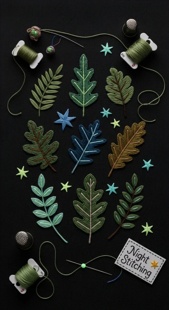 Glow accents can make embroidery feel playful without changing the whole design style. A simple leaf vine, moon motif, tiny stars, or night garden pattern stitched mostly in regular thread can become more interesting with just a little glow-in-the-dark floss in selected areas. This is a fun idea for children’s room decor, zipper pouches, pajama pockets, wall hoops, and gift projects with a whimsical feel. The best approach is to use glow thread as a detail rather than for the whole design. Outline a star. Stitch the center vein of a leaf. Add a few tiny dots around a moon. That way the pattern still looks lovely in daylight and has an extra surprise in the dark. If you are trying to stay budget-friendly, buy just one small glow thread color and pair it with thread you already own. This type of embroidery is especially charming on dark fabric where the contrast feels stronger. It is a simple way to turn an ordinary botanical or celestial pattern into something playful, handmade, and memorable without making the project much more difficult.