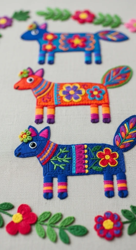 Animal embroidery inspired by folk art traditions can bring so much personality to a project. A bird, deer, fox, rabbit, or cat surrounded by stylized flowers and leaves creates a pattern that feels lively, decorative, and full of character. These motifs often use bold color, simple shapes, and repeated decorative accents rather than realistic anatomy, which makes them very approachable for DIY. A good starting project might be one bird with a flower branch or one small animal framed by leaves. Keep the shapes strong and clear, and let the decorative details support the main figure. This style works beautifully on tote bags, wall hoops, children’s room decor, and cushion covers. If you want to save money, use bright thread scraps in mixed colors rather than buying a large matching set. Folk-style animal embroidery often looks great with visible color variation. The final result feels cheerful and artistic, even when the stitches themselves stay basic. It is an excellent pattern choice for people who want embroidery that feels vivid, story-like, and a little different from the usual floral-only designs.