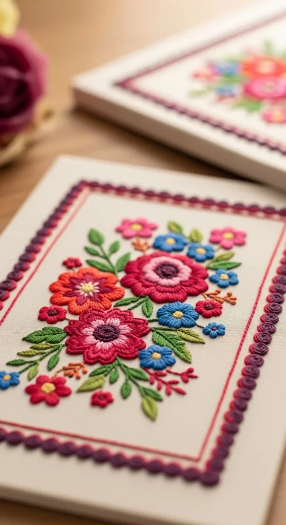 Festive floral fill patterns are useful when you want embroidery that feels richer and more decorative for special seasons or events. These designs often use closer flower spacing, stronger color, and small filler details like dots, leaves, buds, and tiny curved lines. The result feels fuller than minimalist floral embroidery but still manageable if you build it in sections. A good approach is to choose one main bloom shape and repeat it with small changes instead of trying to design many different flowers. That keeps the work cohesive and easier to stitch. Jewel tones like magenta, emerald, gold, deep orange, and rich pink can make the embroidery feel celebratory right away. If you want to keep it affordable, use those stronger shades in just a few areas and let the rest of the pattern stay lighter. This style works especially well on festive clutches, dupattas, table runners, hoop art, and gift fabric wraps. It gives projects a more dressed-up look without needing very advanced 3D stitches. Festive floral fills are ideal when you want your embroidery to feel bright, joyful, and ready for special days.