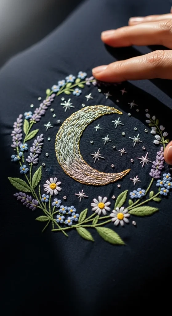 Celestial botanical embroidery feels popular because it combines two beloved themes in one pattern. A crescent moon with tiny stars, little wildflowers, leaves, and dotted details can look dreamy without becoming overly complex. This style is wonderful for hoop art, journal covers, pouches, sleep masks, and gift pieces because it feels calm and decorative. A good beginner-friendly version could be one moon shape with a small floral cluster growing around one side. Keep the flowers simple and use dots or little stitches to suggest stars instead of trying to fill the whole sky. If you want to stay on budget, choose one fabric color and use just two or three floss shades, such as cream, olive, and gold or soft white, green, and dusty blue. The contrast between celestial shapes and natural florals gives the pattern a gentle magical feel. It is a very flexible style because it can lean boho, minimal, romantic, or whimsical depending on the thread colors you pick. This is a beautiful pattern choice for anyone who enjoys soft symbolism and calm decorative motifs.