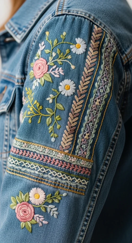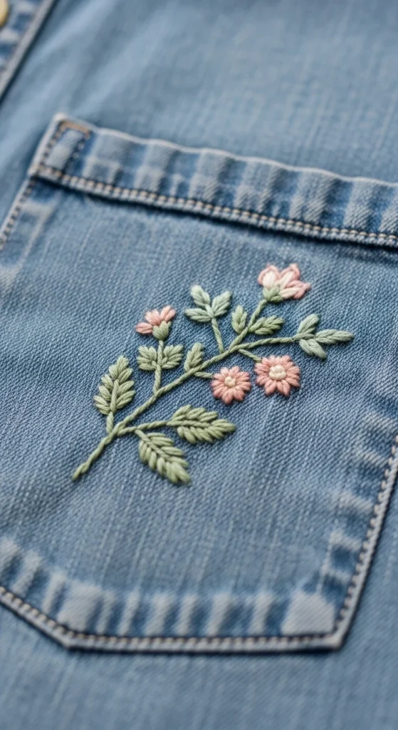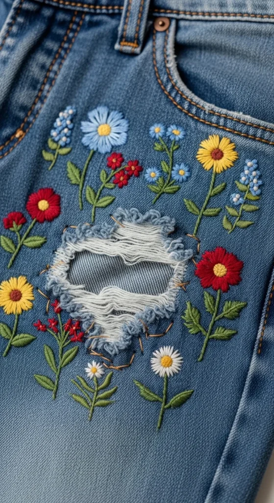 Floral visible mending on denim is a clever way to make repairs feel intentional and beautiful. Instead of hiding a worn spot, patch it and stitch a little meadow of flowers, leaves, and stems across the area. This works well because denim can handle embroidery nicely and the contrast makes the stitching stand out. A torn knee, weak pocket, or faded jacket elbow can all become part of the design. Start with a small patch underneath if the fabric is thin, then stitch simple flowers across the repair zone. Keep the floral shapes uncomplicated so the focus stays on the cheerful effect rather than perfect detail. This is a wonderful budget-friendly embroidery project because it extends the life of clothes you already own. It also feels personal in a way store-bought patched denim does not. Wildflower mending patterns can be bright and playful or soft and subtle depending on your thread choice. It is a very satisfying way to mix usefulness and decoration in one project, especially for people who like DIY clothing with a gentle handmade touch.
