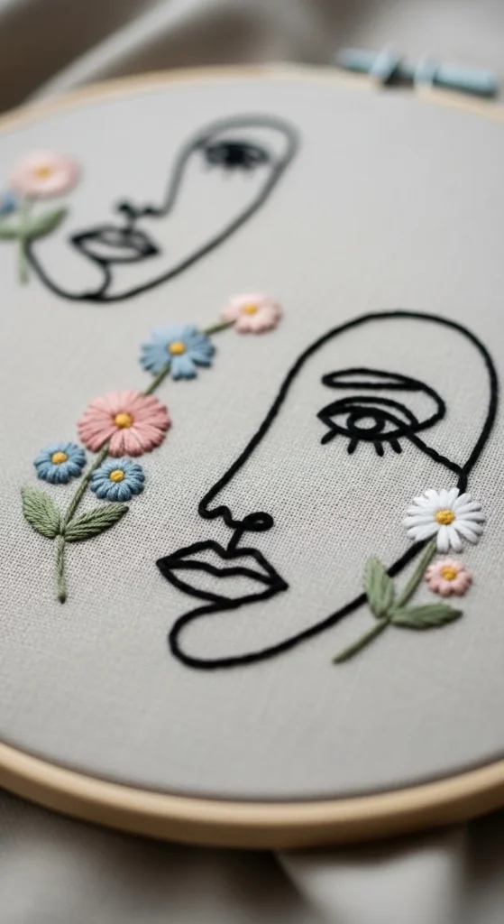 Abstract face embroidery paired with floral accents has become a popular modern style because it feels artistic without requiring a huge number of stitches. A single face outline with one flower stem crossing the cheek or one leaf cluster near the neck can create a striking design using mostly line work. This is a strong choice for hoop art, tote bags, and wall decor because the pattern itself feels like illustration. If you are new to this style, start with a very simple profile or continuous line face and keep the floral accents small. The beauty comes from the balance between the line drawing and the botanical softness. Use one or two thread colors only to keep the look clean. Black line work with olive leaves or rust flowers is a simple, budget-friendly combination that works on many fabrics. This pattern style feels current, stylish, and creative without needing a lot of fill stitching. It is especially good for people who like embroidery that looks more like modern art than traditional decorative craft. A few well-placed lines can create a very memorable finished piece.