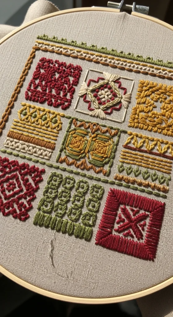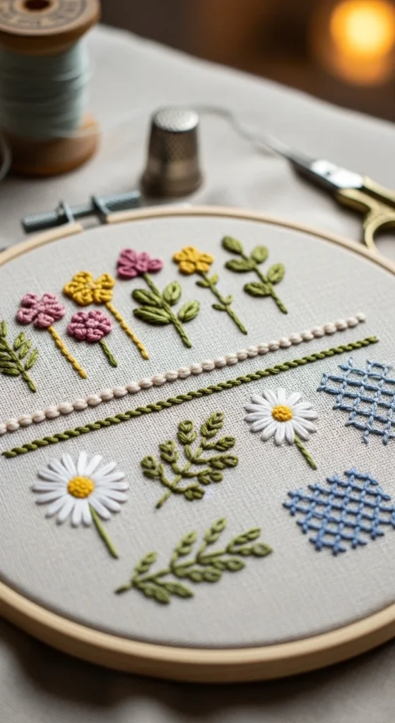 A sampler hoop is one of the smartest embroidery pattern ideas because it lets you try many motifs in one project. Instead of committing to one large design, divide the hoop into sections and stitch small flowers, leaves, knot clusters, line art, border rows, geometric shapes, and tiny decorative motifs across the fabric. This gives you a finished piece that also works like practice. It is perfect for beginners who want to improve without making endless separate test swatches. It is also a great stash-busting project because you can use leftover thread in small amounts. A hoop sampler can lean floral, modern, heritage-inspired, or mixed depending on what you include. One section might be a rose. Another might be a Sashiko-style repeat. Another might be a monogram or a moon motif. The variety keeps the project interesting and lets you discover which styles you enjoy most. Once done, the hoop looks decorative on its own and also becomes a useful reference for future projects. It is practical, creative, and one of the best ways to explore hand embroidery patterns without feeling locked into a single design style.