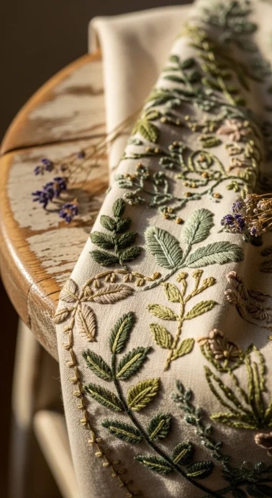 Eco-minded embroidery patterns are becoming more popular because many stitchers want beautiful projects that also feel practical and thoughtful. A floral design stitched with earthy greens, dusty pinks, warm rust tones, and natural cotton fabric creates a calm, handmade look that feels easy to use in everyday decor. This style is less about one special stitch and more about the materials and color choices. Start with a simple leaf vine, one small flower, and a neutral background. If you already have leftover floss from older projects, use that first instead of buying an entire new thread set. Mixing slightly different greens can actually make the botanical pattern look more natural. This kind of embroidery works well on reusable napkins, tote bags, fabric pouches, and mending patches because it turns practical fabric items into something nicer to keep. A good way to stay budget-friendly is to stitch on thrifted cotton shirts, old tea towels, or fabric scraps from sewing projects. The final look feels soft, useful, and gentle rather than overly polished. It is a strong pattern choice for anyone who likes floral embroidery with a natural, grounded mood and a simple material setup.