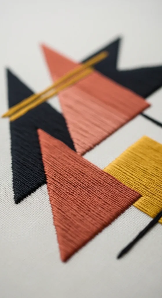 Geometric embroidery patterns are perfect for stitchers who want something less floral and more graphic. These designs use triangles, circles, grids, arches, and sharp lines to create a clean, modern look. They work especially well on home decor and accessories because the shapes feel structured and bold. A good beginner version might include one large arch, a few stacked triangles, and some small stitched dots around them. This gives the design interest without making the layout too complicated. If you want a low-cost project, geometric patterns are great because they often need fewer thread colors than floral work. You can make a strong design with just black, rust, mustard, or one soft neutral. This style looks especially nice on cushion covers, wall hoops, pouches, and jacket panels where the shapes have room to breathe. Use a ruler and washable pencil to sketch the layout first so the lines stay balanced. If your stitches are not perfectly even yet, geometric patterns can still look good because the structure carries the design. This is a very practical style for anyone who likes modern decor, simple forms, and embroidery that feels fresh without relying on flowers.