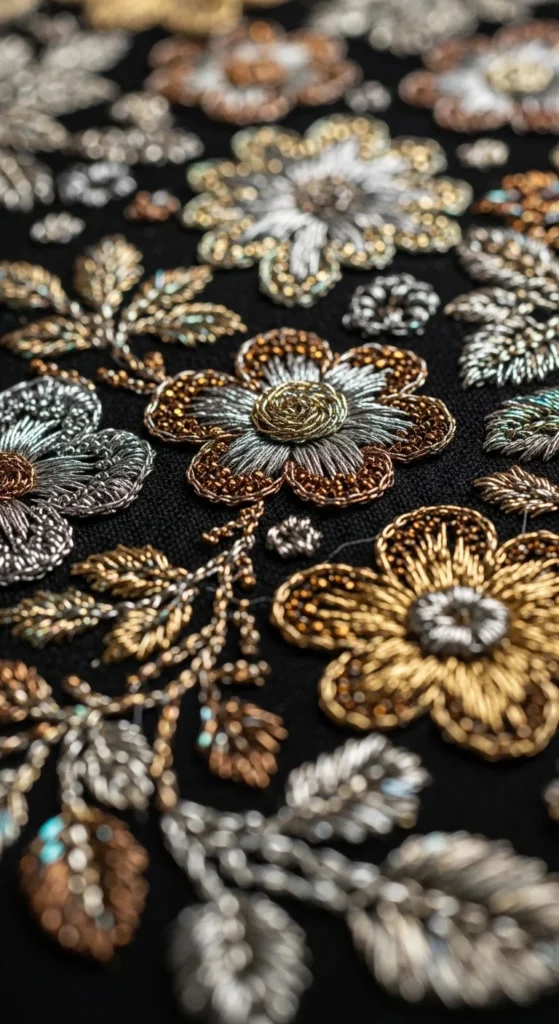 Metallic thread embroidery can make even a small pattern feel special. A simple flower, moon, starburst, or geometric border stitched with a bit of shimmer stands out beautifully on dark fabric. This style works best when the metallic thread is used as an accent rather than for the whole design. A rose with one metallic outline or a leaf vine with a few sparkling details often looks more balanced than a fully shiny pattern. If you are trying to save money, mix one metallic thread color with ordinary embroidery floss you already own. That gives the piece enough glow without making the project more difficult than it needs to be. Metallic thread can twist or catch, so shorter thread lengths usually help. Use it on projects where the shine can really show, like evening clutches, festive hoop art, decorative cuffs, or gift pouches. This pattern style is especially nice when you want embroidery that feels a little dressier or more celebratory. Even a very basic motif can look much richer once a small hint of metallic stitching is added. It is a simple way to create contrast, light, and visual focus.
