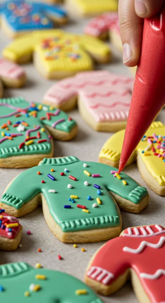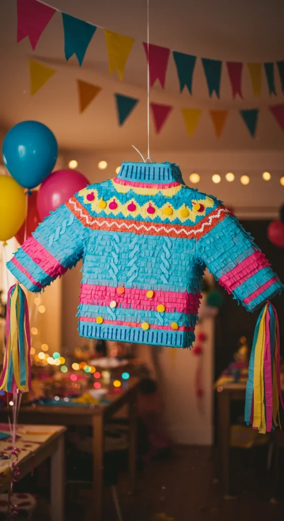 Bake sweater-shaped cookies and let everyone decorate them with frosting and sprinkles. It’s a sweet, hands-on party activity that doubles as dessert. Use a simple cookie cutter and affordable icing tubes for easy cleanup.